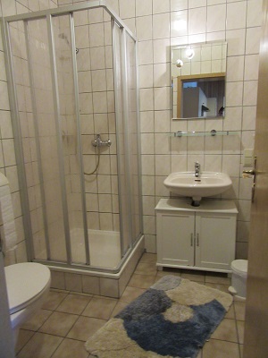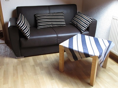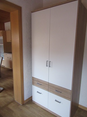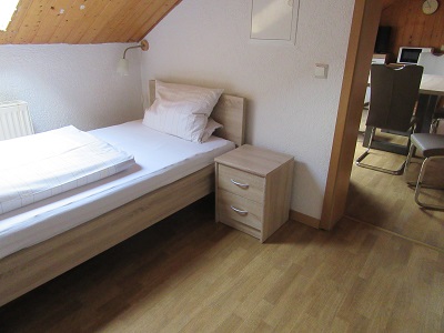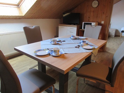 Dachgeschoßwohnung mit Wohn-Eßaum mit Küchenzeile, Elternschlafzimmern, kleines Kinderschlafzimmer und Bad. Alle Fenster sind mit Rollos verdunkelbar.